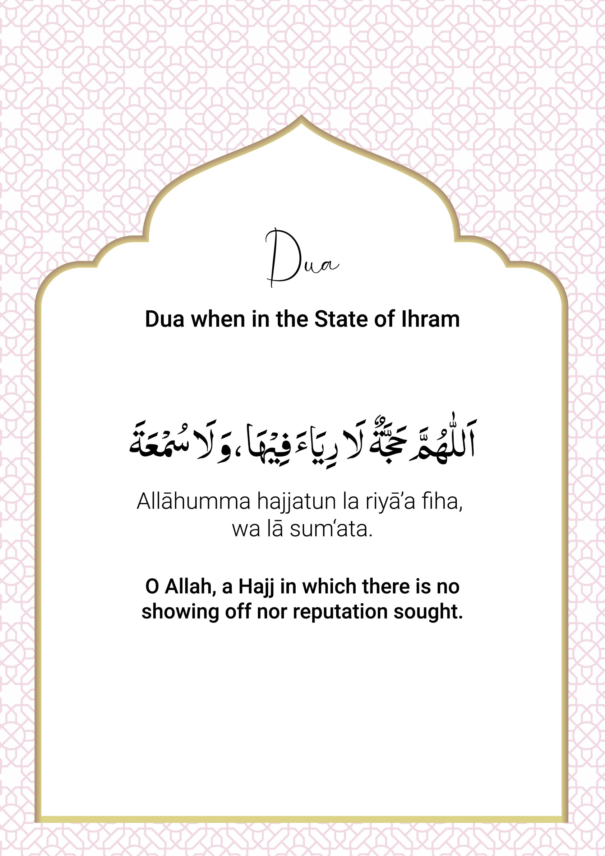 : "اَللّٰهُمَّ حَجَّةٌ لَا رِيَاءَ فِيْهَا ، وَلَا سُمْعَةَ" ("
